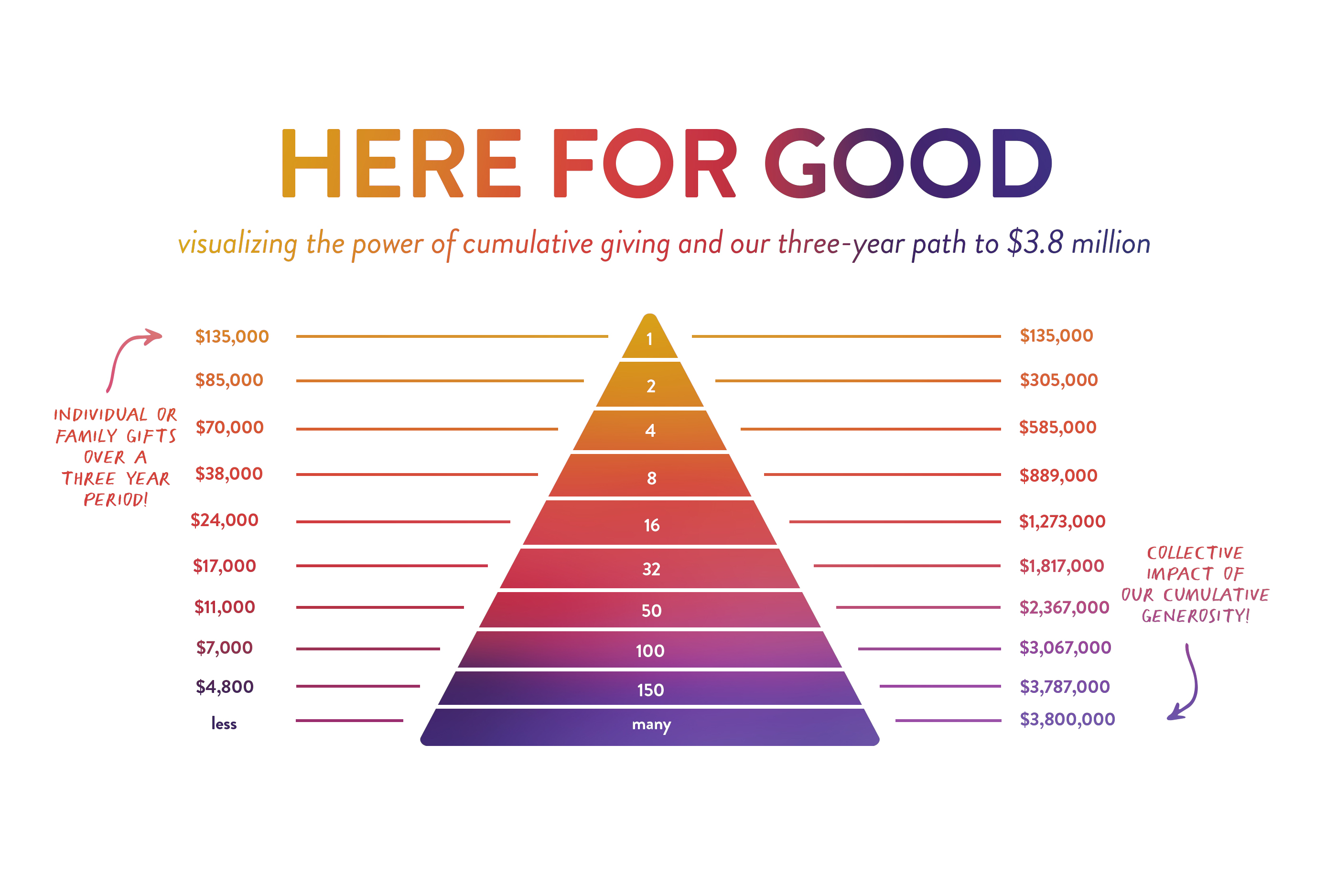Below you'll find a giving chart that showcases the way that our cumulative generosity can provide a realistic pathway to fully funding our Here For Good campaign.